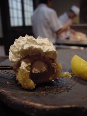 Finish - Frozen Banana coated with a brown sugar and cinnamon cake then breaded and deep fried and topped with whip cream | |